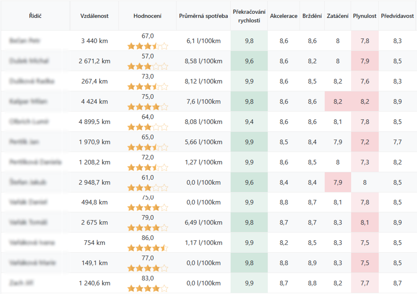 Plynulost jízdy: Celková plynulost a stabilita jízdy.